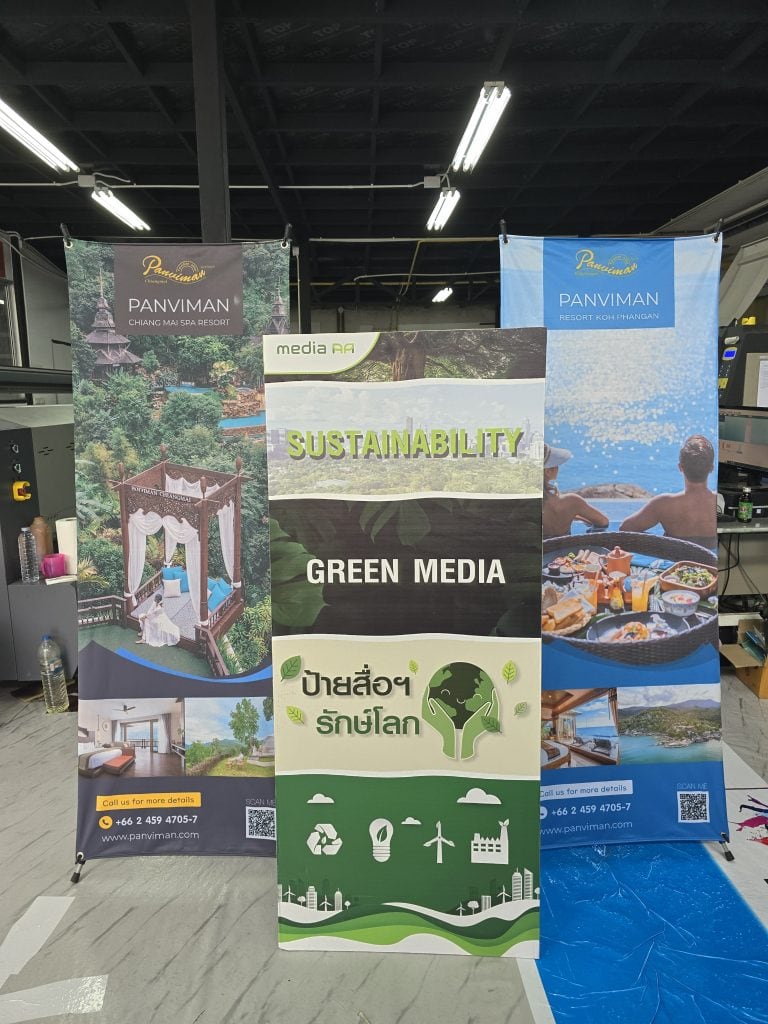 หากคุณกำลังมองหาป้ายออกบูธที่ตอบโจทย์ทั้งการใช้งานและความยั่งยืน Media AA มีตัวเลือกป้ายทำจากวัสดุรีไซเคิลคุณภาพสูง ไม่ว่าจะเป็นป้ายธงผ้า ป้ายออกบูธ หรือแบคดรอปผ้ารีไซเคิล ทุกชิ้นออกแบบมาให้ใช้งานได้ทนทาน พกพาง่าย และติดตั้งสะดวก พร้อมพิมพ์สีสันสดใส ปลอดภัยต่อสิ่งแวดล้อม ช่วยเสริมภาพลักษณ์องค์กรที่ใส่ใจสิ่งแวดล้อมทุกงานอีเวนต์